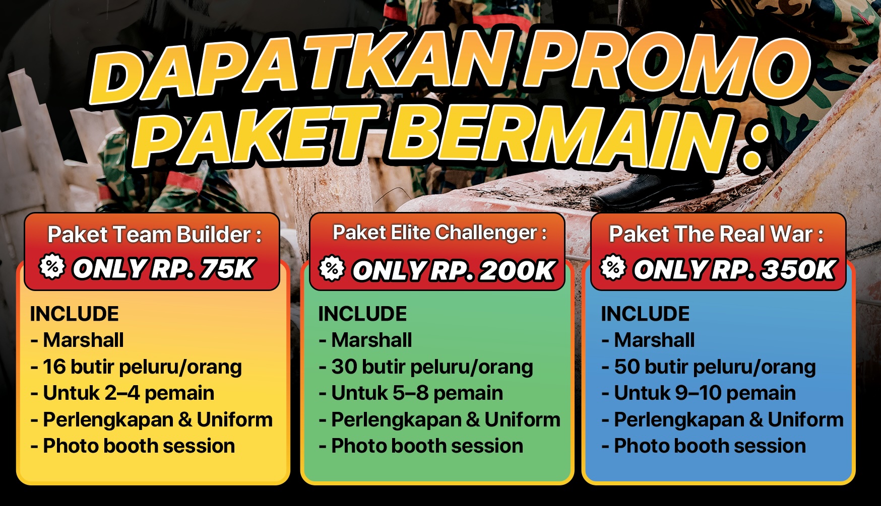 The sensation of shooting like in a war, right on the hill altitude of 1.500 meters above sea level. Setup of military costume, strategy formulation and the use of international standard marker with choice of packages which including googles mask, uniform, safety & CO2 tank.